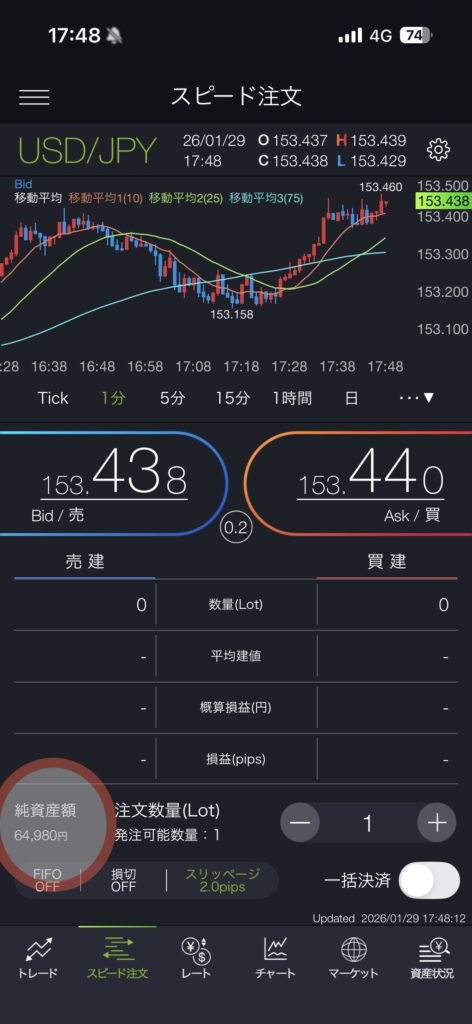 入金を済ませ、DMM FXの「スピード注文」画面を開く。