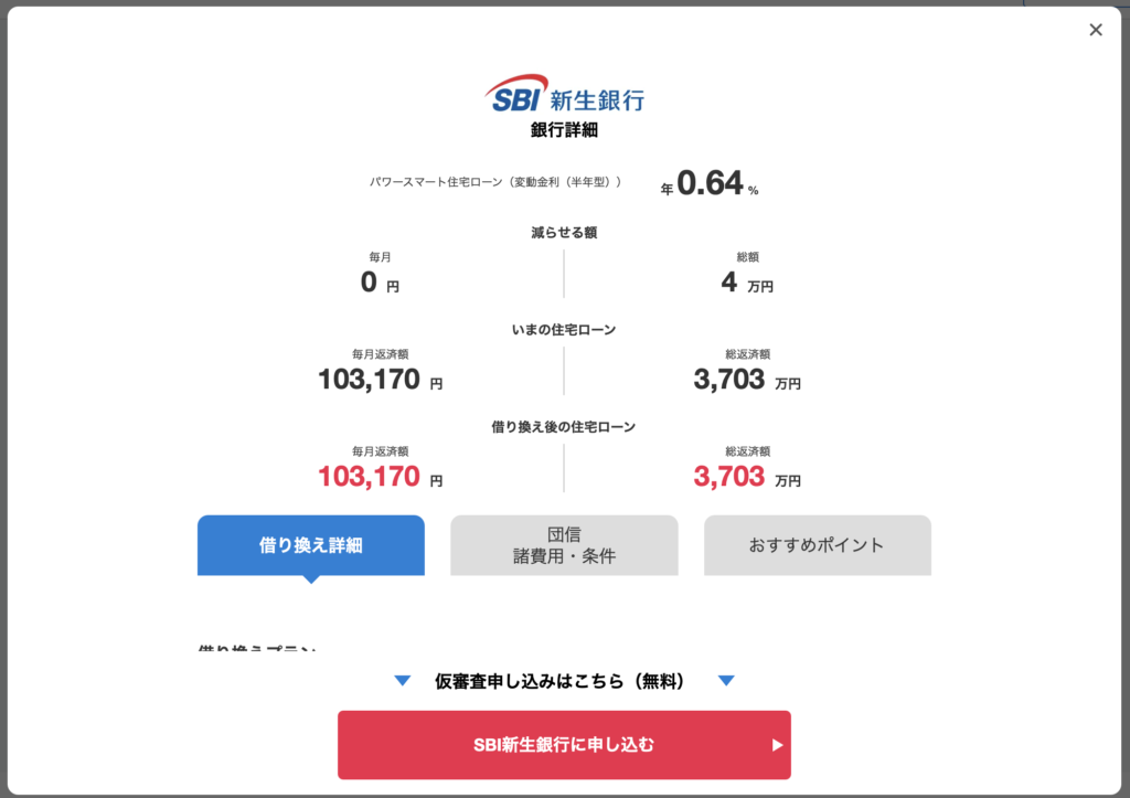 金利は0.64%まで下がる。毎月の返済額は変わらないが、総返済額が4万円ほど減るシミュレーションだに。